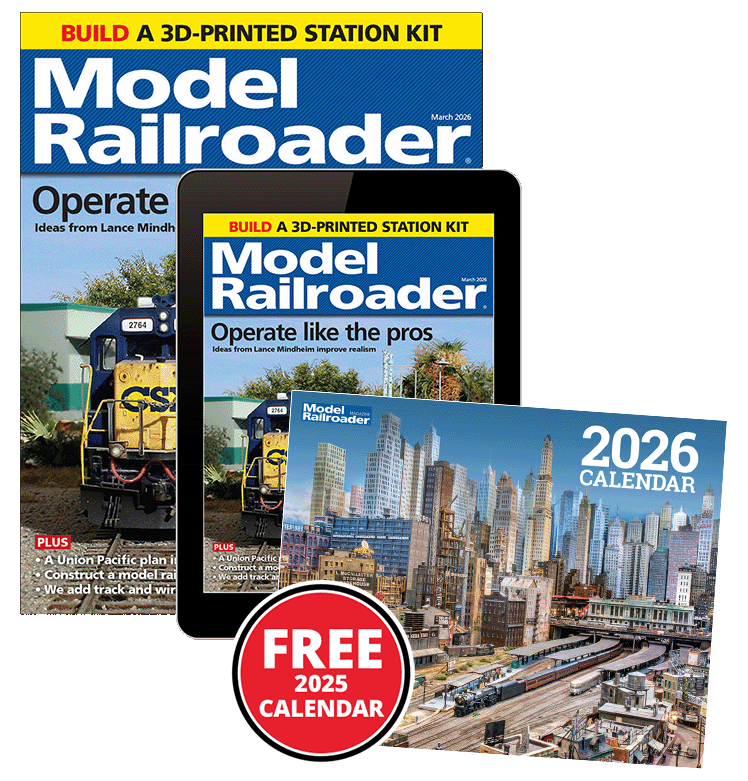 YES! Send me a full year of Model Railroader magazine for the offer I've selected. As a BONUS, I'll also receive a gift - the Model Railroader 2026 Calendar ($14.99 Value) FREE! Subscription includes: -Print and/or Digital issues of Model Railroader magazine -Weekly e-newsletter -Workshop Webcam on Trains.com -Model Railroader Track Plan Database on Trains.com -FREE Gift: Model Railroader 2026 Calendar (available to U.S. addresses only while supplies last)
